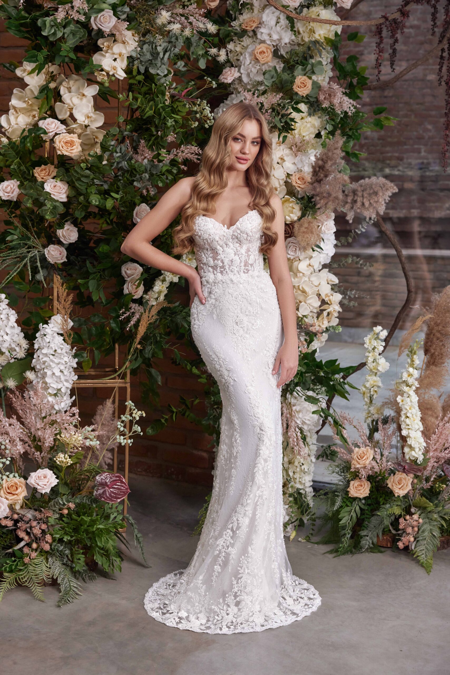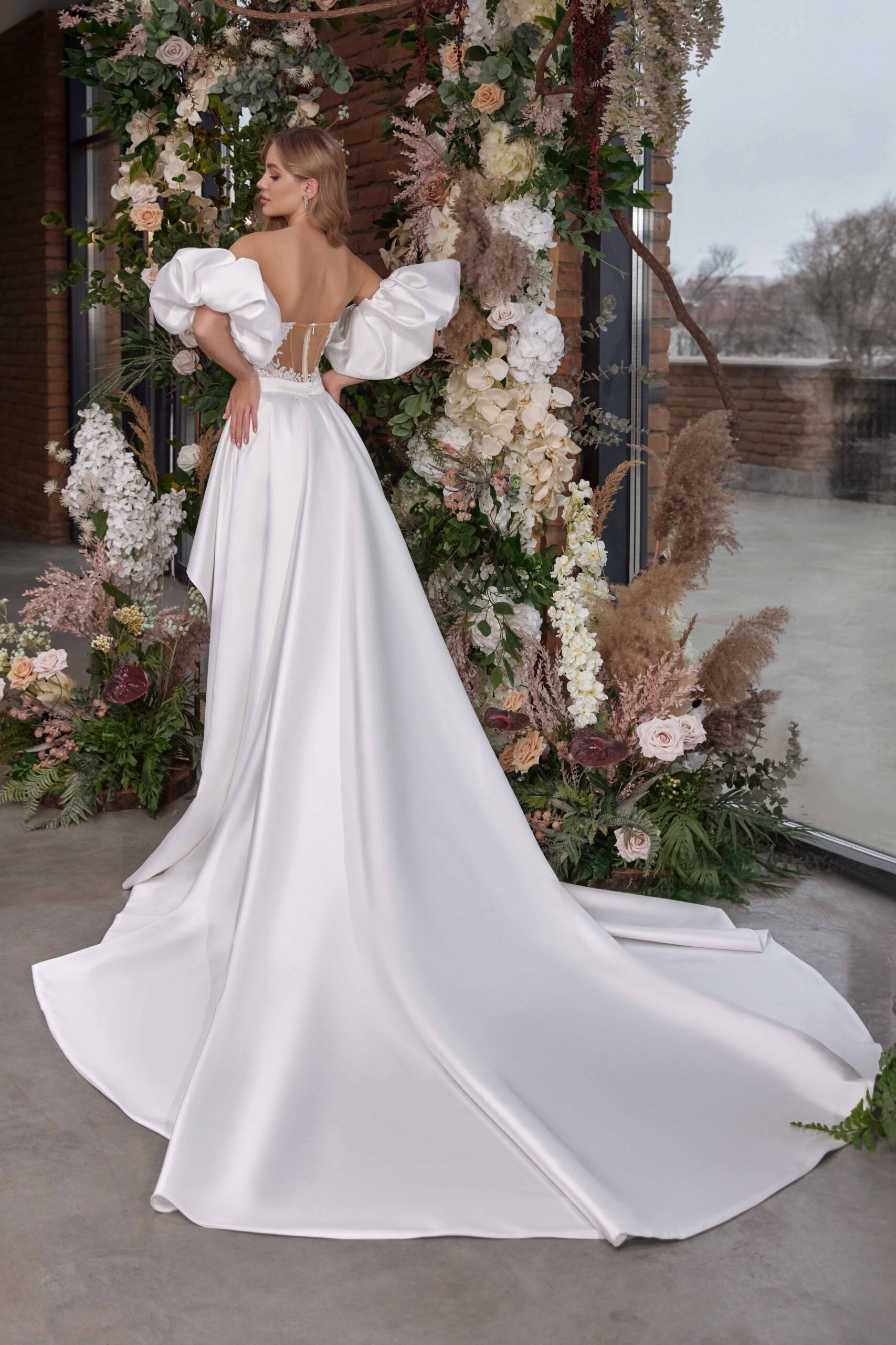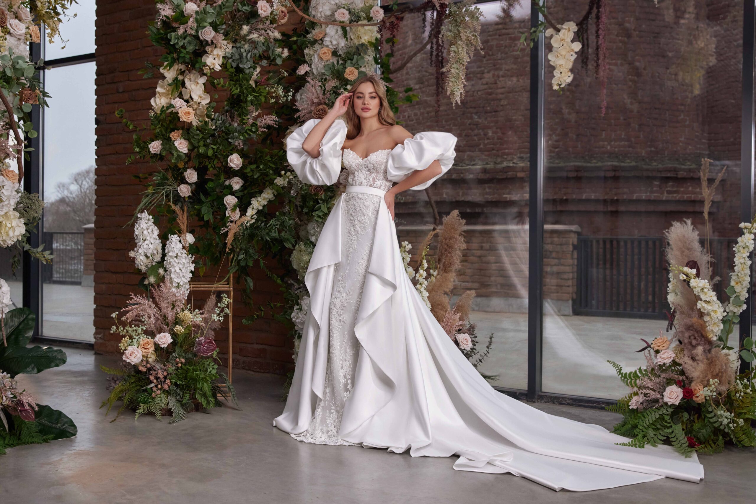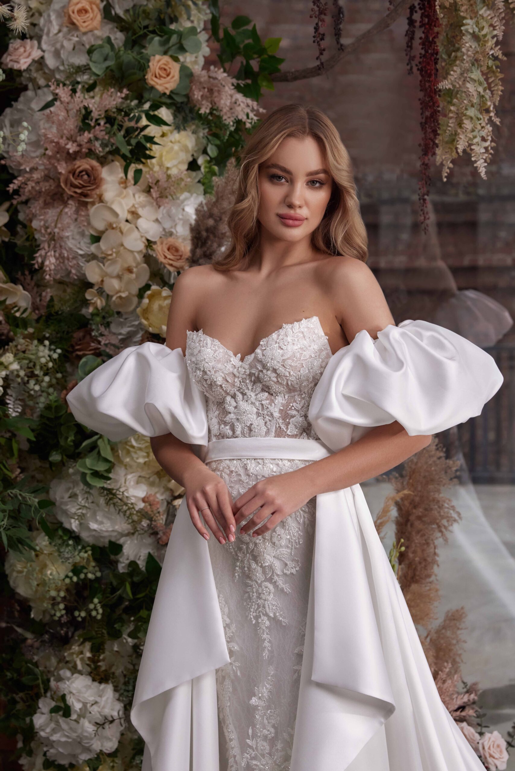 Danica wedding dress is a breathtaking mermaid-style gown designed with intricate beads and sequins to bring an extra element of glitz and glamour. The removable puffy sleeves add a romantic touch while the removable soft satin train gives the dress an ethereal finish. Nothing compares to the designer-made back – it features delicate lace patterns that sparkle in any setting, making it utterly captivating. For an added flair, this breathtaking gown comes with a cat-ear sweetheart corset top that adds a unique style to the look.