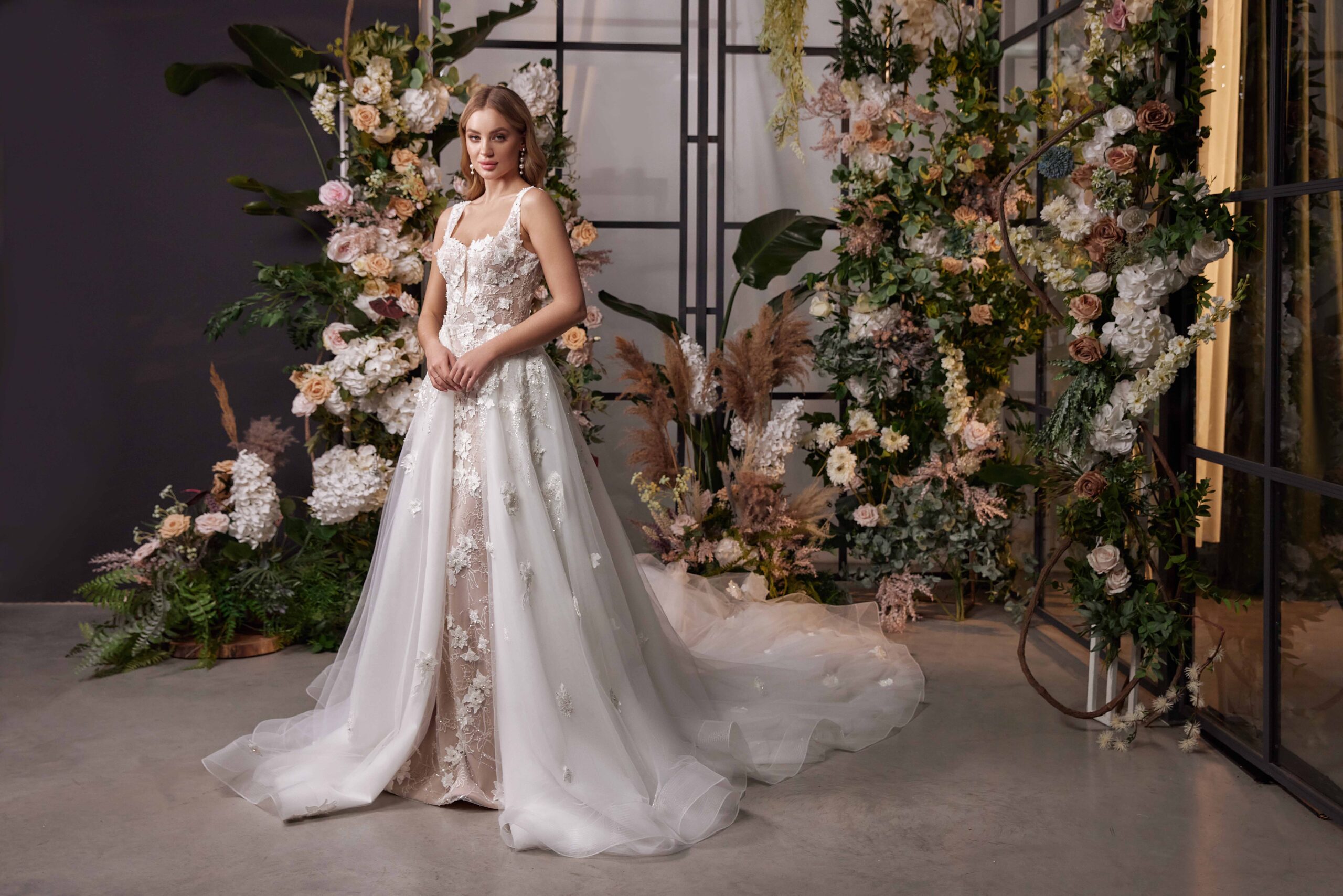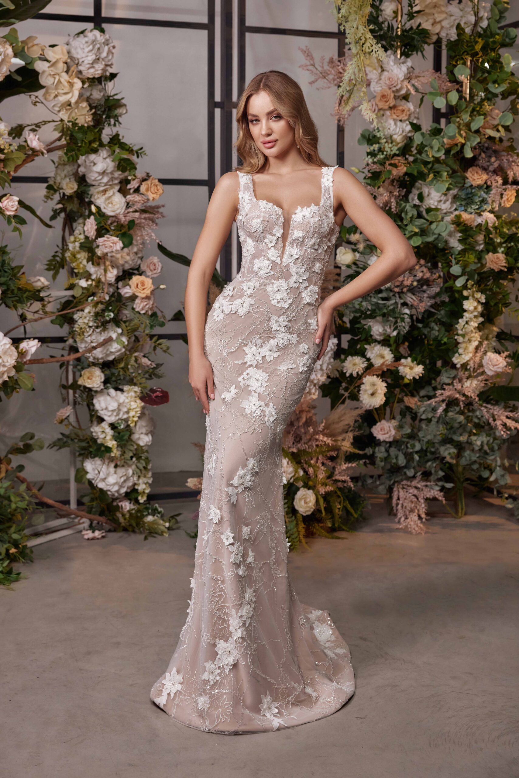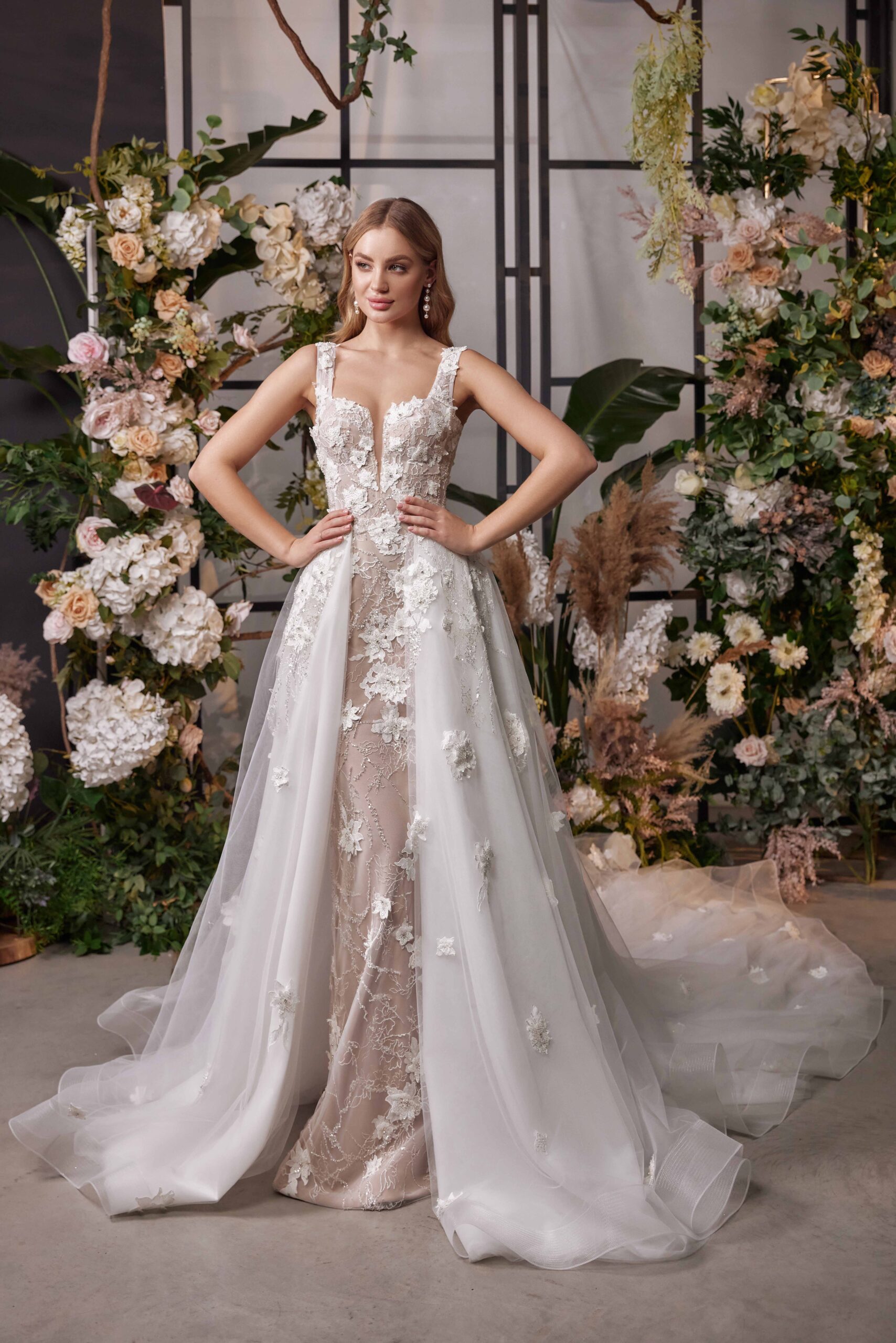 Elanor is an exquisite wedding dress that will leave any bride feeling truly glamorous on her special day. This stunning mermaid-style gown features a bold, plunging neckline that draws attention to the bride’s femininity, complemented by its close-fitting silhouette and delicate 3D lace detailing. Its off-white removable train is studded with an array of beautiful floral embellishments, adding a touch of classic elegance.