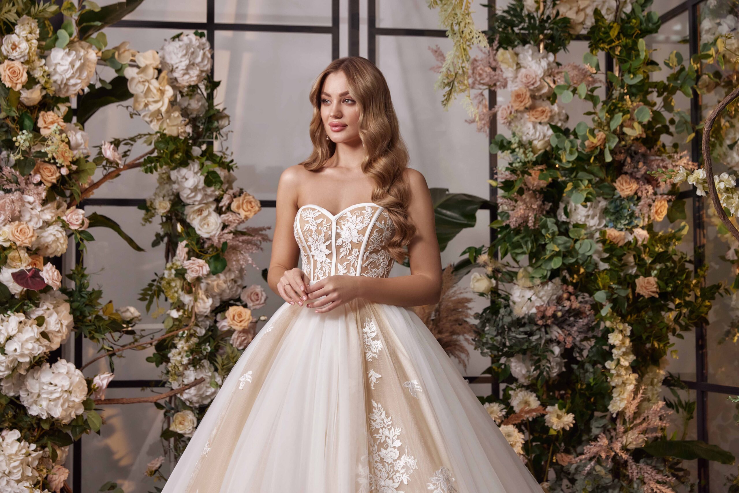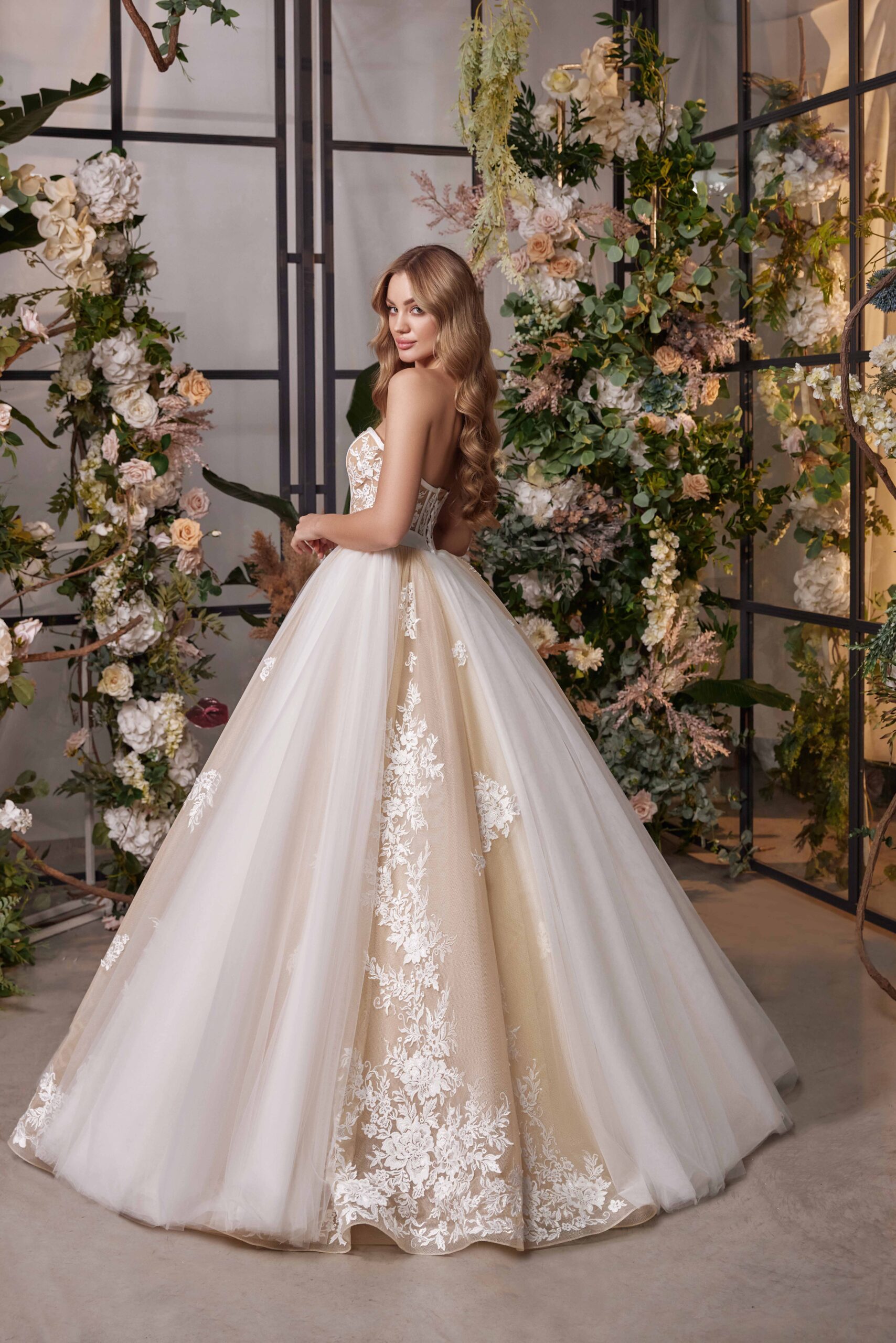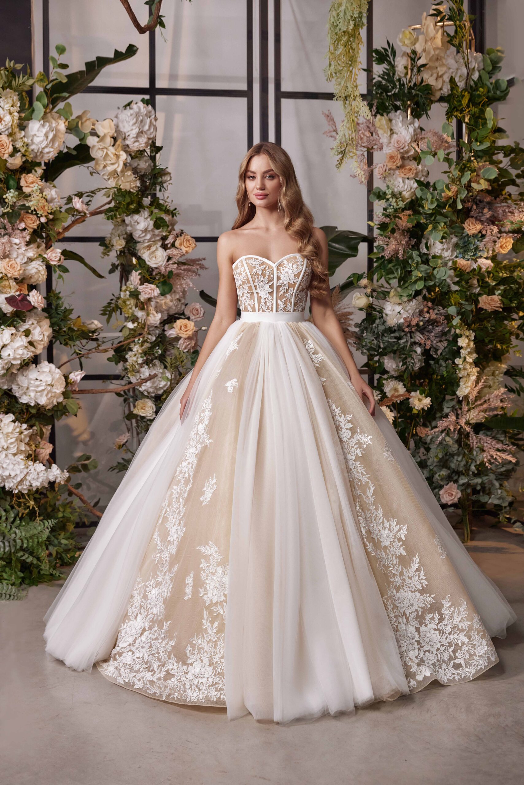Garleia wedding dress is a stunningly gorgeous piece of couture, perfect for any elegant and timeless bride. The corset is cleverly constructed with satin strips that hug the figure and create a beautiful silhouette. Delicate matte lace cascades throughout the bodice, while long tulle overlays create an airy feel through the skirt. This breathtaking ballgown is partially nude, making it a subtle yet powerful statement. This designer wedding gown will definitely stand out in any bridal salon’s collection thanks to its exquisite detailing and craftsmanship. A timeless classic, this look can easily be accessorized to transform from traditional to modern depending on the bride’s style preference. Garleia offers a unique combination of delicate romance and regal sophistication that makes it truly one-of-a-kind. Brides around the world will be enchanted by its beauty and charm, making this a standout choice among designer wedding gowns.