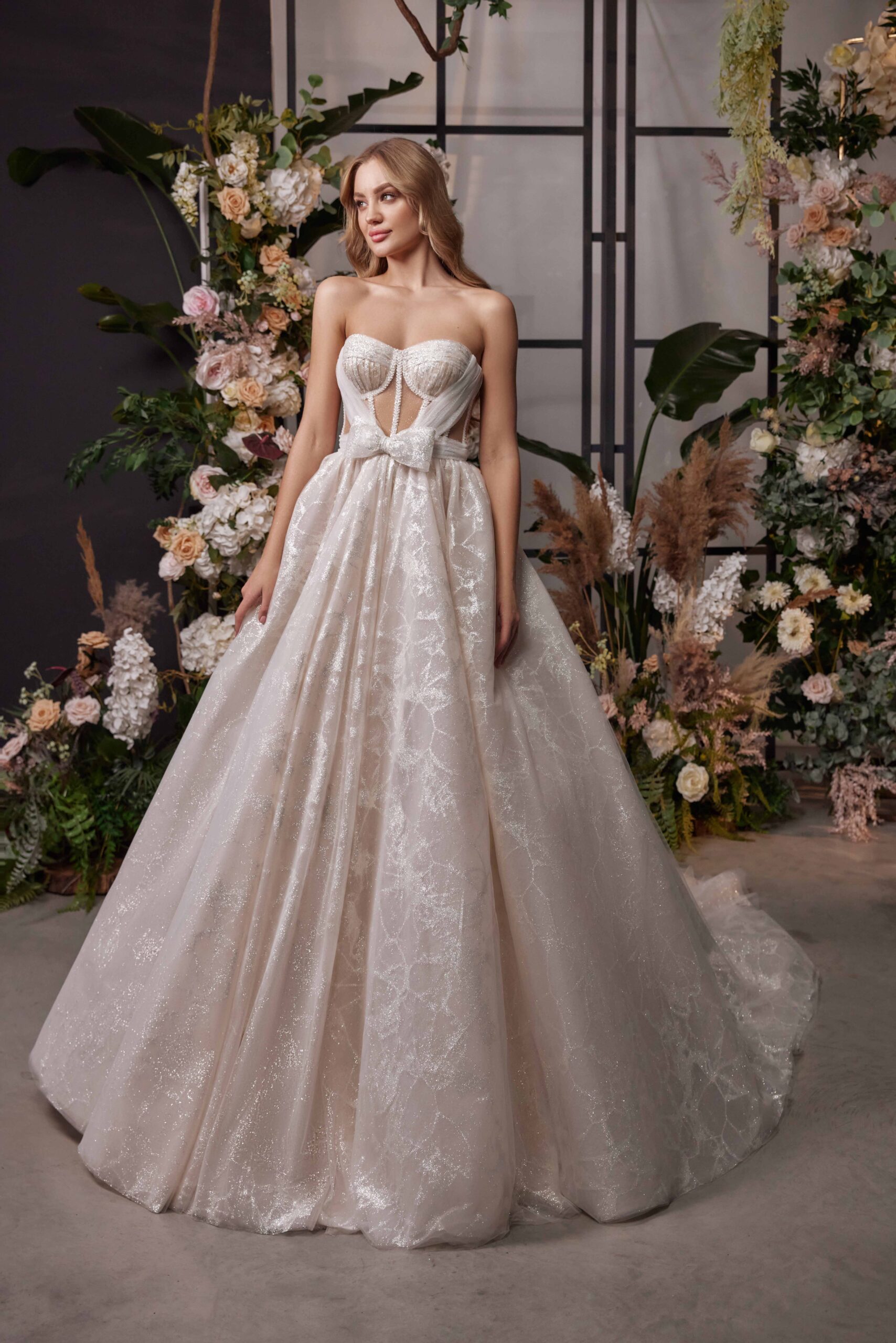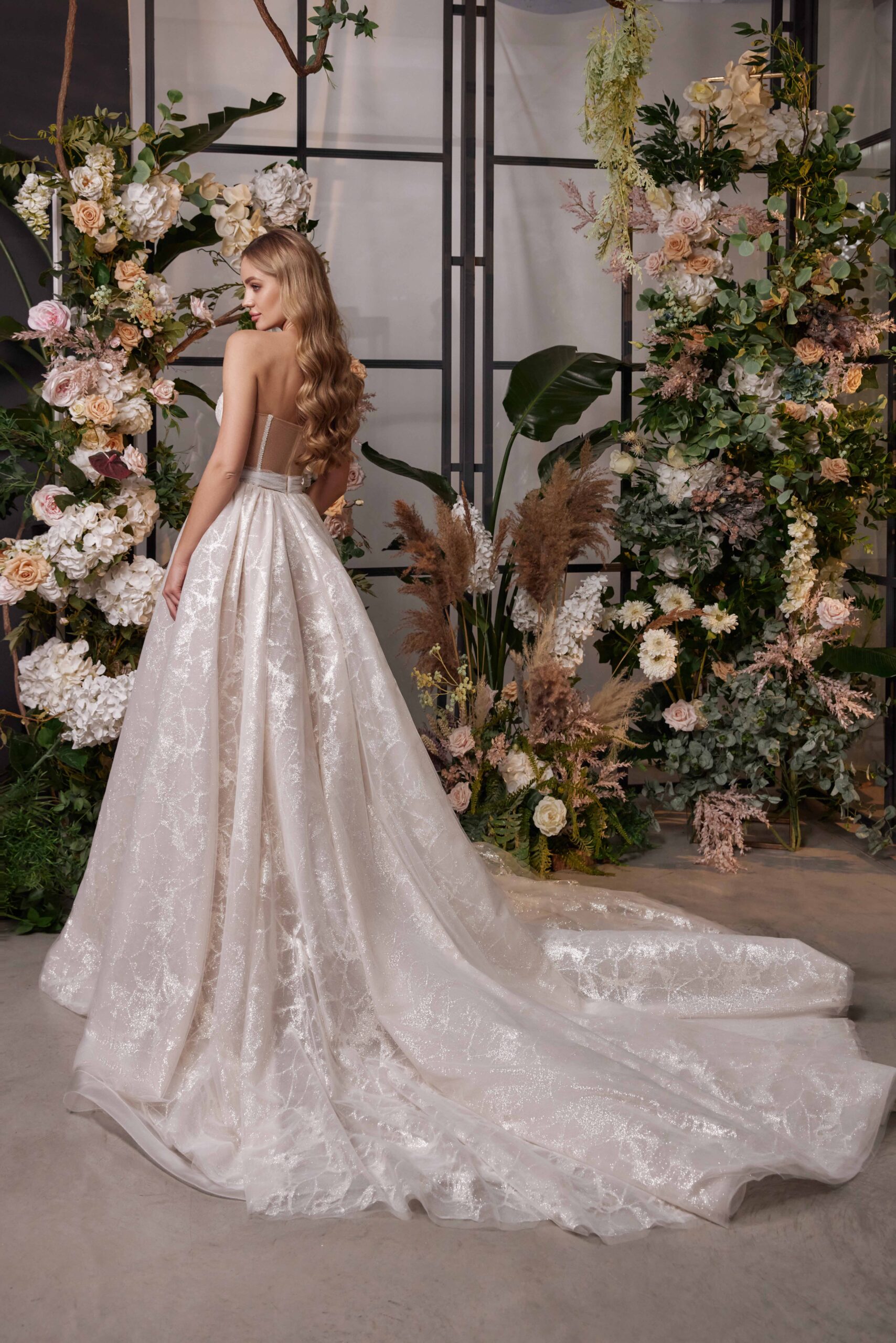 Mariela by Illumina Bridal is an exquisite wedding dress that radiates beauty and elegance. The bodice features elaborate beading, intricate embroidery, and a sweetheart neckline that flatters the collarbone and emphasizes the bride’s natural curves. The A-line silhouette is designed to flatter all body types and provide a timeless look. The beautiful glittering fabric truly sets this wedding gown apart, making it a showstopper. The attention to detail on this dress is something unlike any other gown on the market, with each bead and thread placed strategically to create a stunning look from every angle. Not only will Mariela help brides feel like royalty at their ceremonies, but it also ensures that all photographs taken throughout the day will capture her beauty in its entirety.