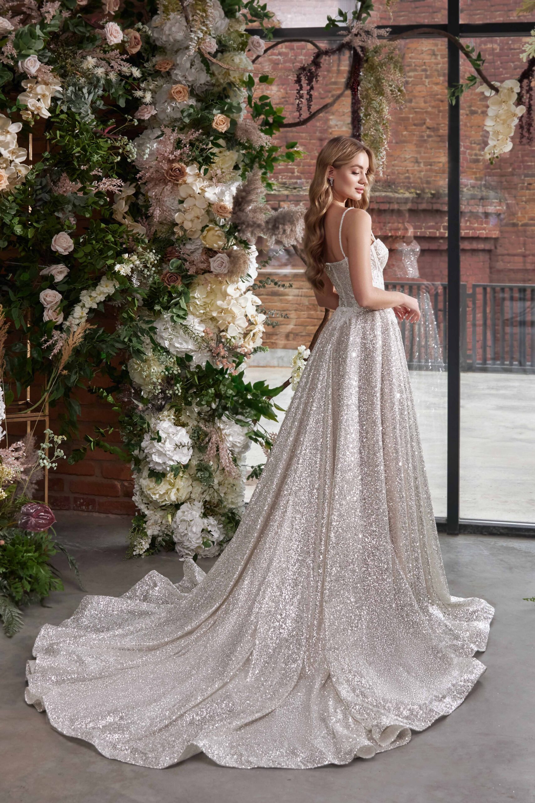 Nova is an exquisite A-line wedding dress crafted for any bride seeking to look brighter and more beautiful than the stars. This stunning dress features a corseted bustier bodice with an off-white applique streaming gracefully down the skirt, complemented by a platinum glitter finish that shimmers and shines even in the dimmest lighting. The unique combi-dress design features a high slit that is both sexy and stylish, finished off with spaghetti straps and a zipper back that offer a hint of allure. Finally, an elegant small train adds the perfect finishing touch to this beautiful bridal creation. Nova’s delicate fabric moves freely as the bride walks or twirls around the room. The warm hue of ivory and platinum creates an enchanting atmosphere that looks just as good during outdoor ceremonies as it does indoors. Furthermore, its intricate embroidery detailing brings out the inner goddess and adds character to the overall look on the most special day.